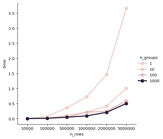 importnumpyasnpimportpolarsasplimportpolars_kdeaspkimportseabornassnsimporttimedefbenchmark(n_groups,n_rows):df=pl.DataFrame({"id":np.random.randint(0,n_groups,n_rows),"values":np.random.normal(0,1,n_rows),}).with_columns(values=pl.col("values")+pl.col("id")*0.1).cast({"values":pl.Float32})eval_points=[x/100forxinrange(-50,50)]start=time.time()df_kde=(df.group_by("id").agg(kde=pk.kde("values",eval_points=eval_points),))end=time.time()df_bench=pl.DataFrame({"n_groups":[n_groups],"n_rows":[n_rows],"time":[end-start]})returndf_benchbench_n_groups=[1,10,100,1000]bench_n_rows=[10_000,100_000,500_000,1_000_000,2_000_000,5_000_000]# Include this to generate the plot.# Here, I added the output on my local machine with 8 cores,# since the build agent is single core and we would not see# any parallelization.# df_bench = pl.concat([# benchmark(n_groups, n_rows)# for n_groups in bench_n_groups# for n_rows in bench_n_rows# ])# sns.catplot(# df_bench,# x="n_rows",# y="time",# hue="n_groups",# kind="point"# )